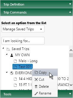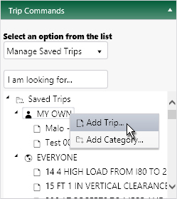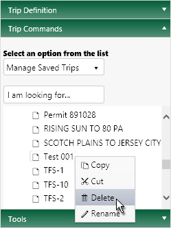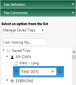 With an application open to the Trip page, access the Trip Commands pane and choose Manage Saved Trips from the drop-down.