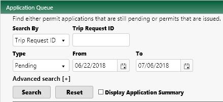Click the Search button to scan the database for applications/permits that conform to your parameters, or click the Reset button to clear all information from the panel.