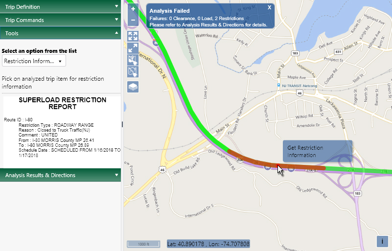 The cursor is now equipped to identify the restriction, so move it over the map and right-click on a red portion of the route then left-click the Get Restriction Information button.